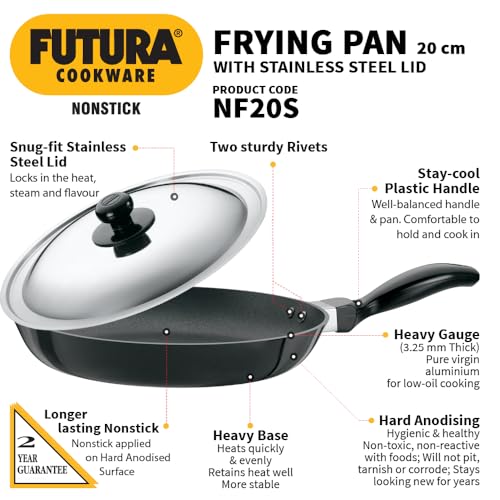 Hawkins Futura 20 cm Frying Pan, Non Stick Fry Pan with Stainless Steel Lid, Small Frying Pan, Black (NF20S)