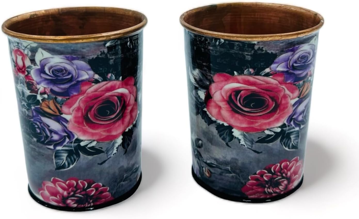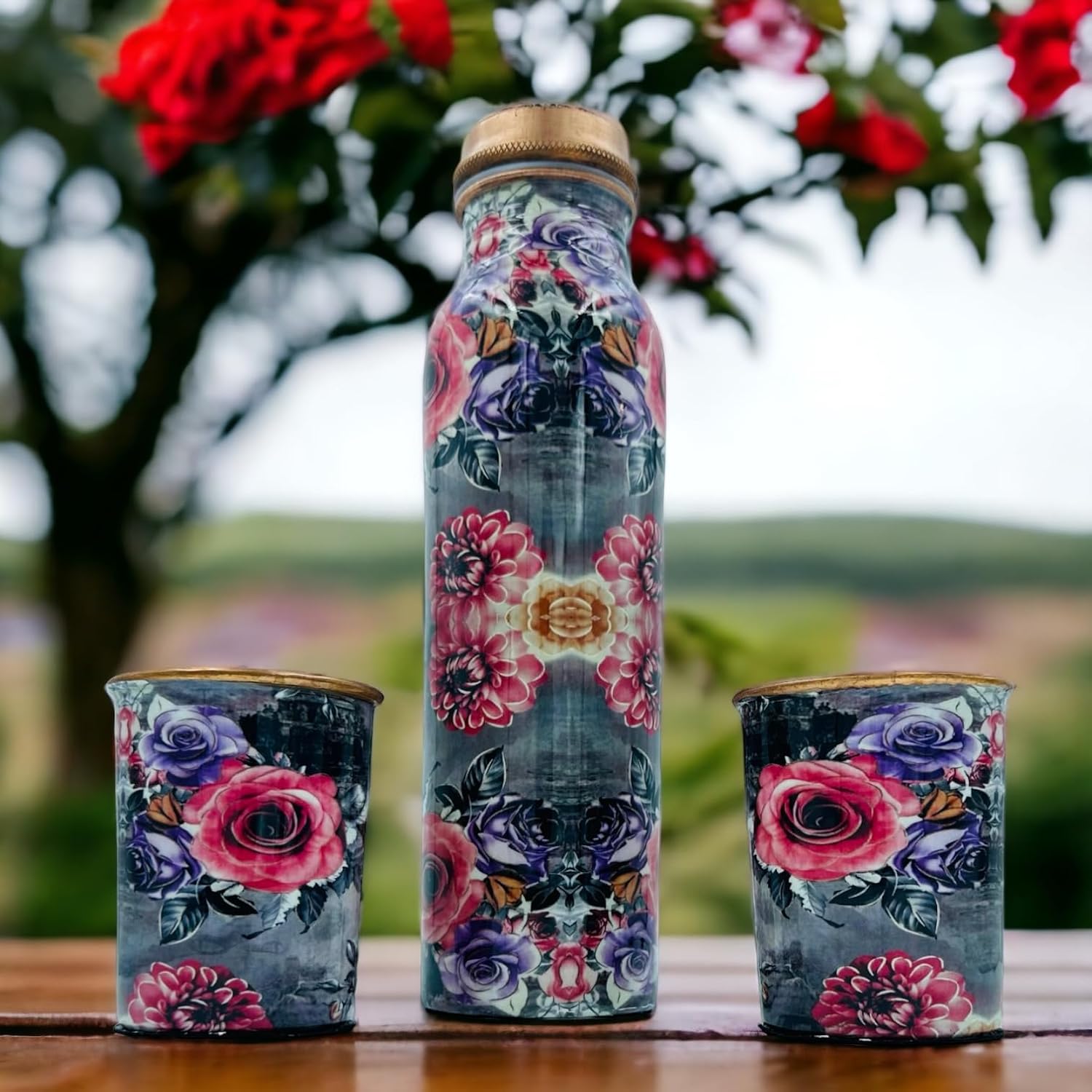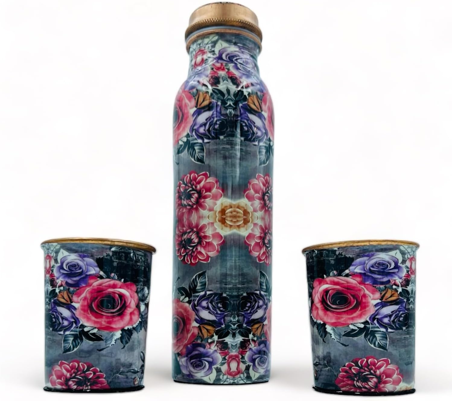 Bhanu Priya - Flower Printed Copper Water Bottle (1L) with 2 Copper Glasses (250ml Each) Combo