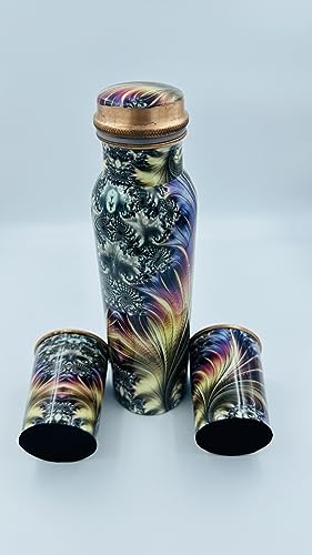 Bhanu Priya - Multicolor Printed Copper Water Bottle (1L) with 2 Copper Glasses (250ml Each) Combo