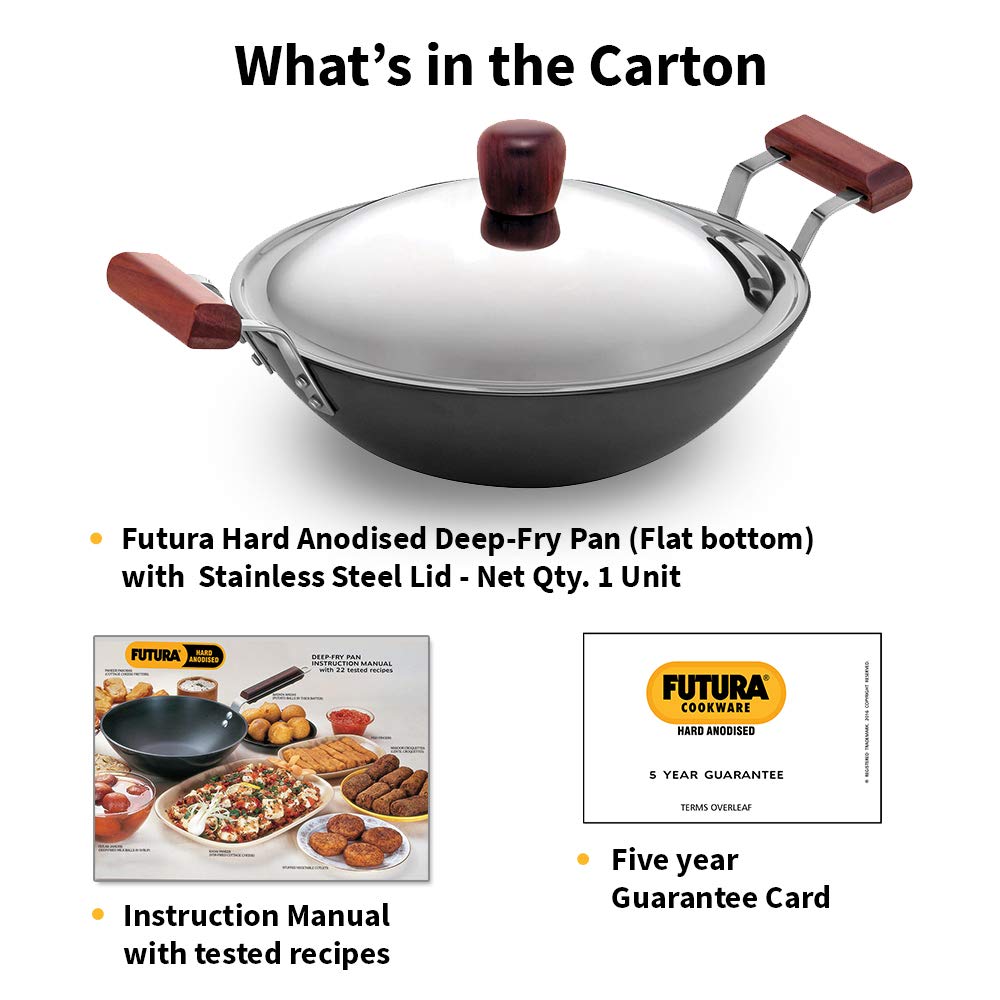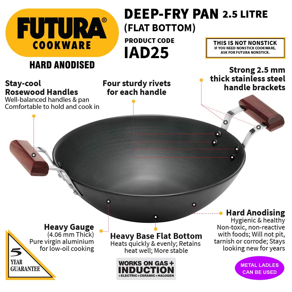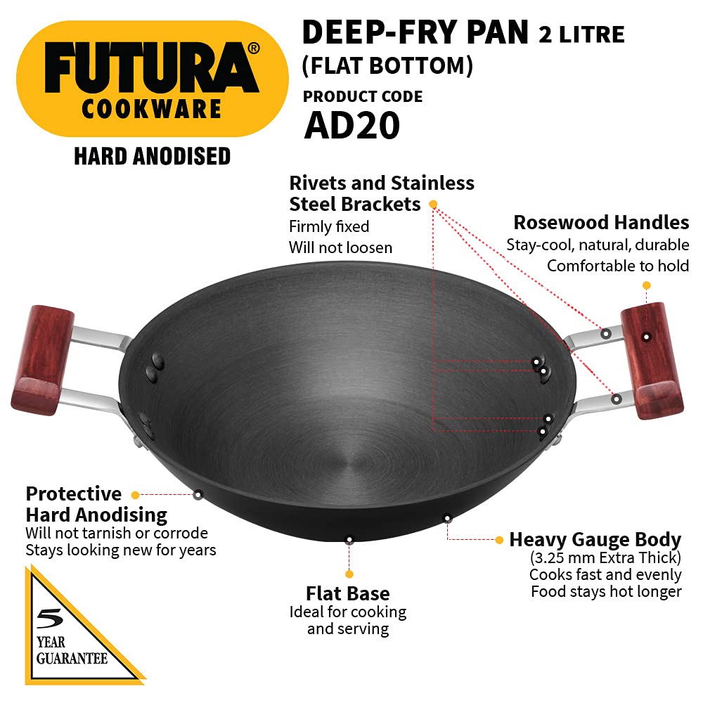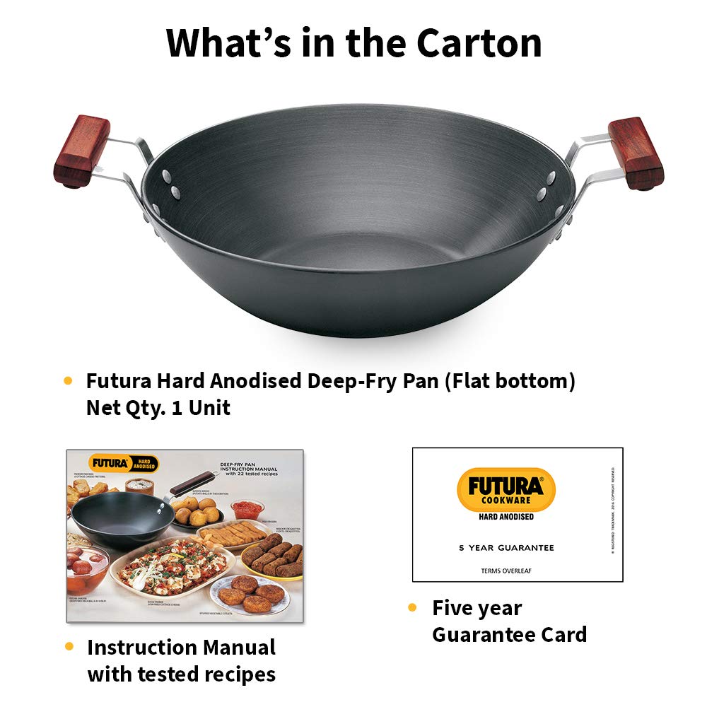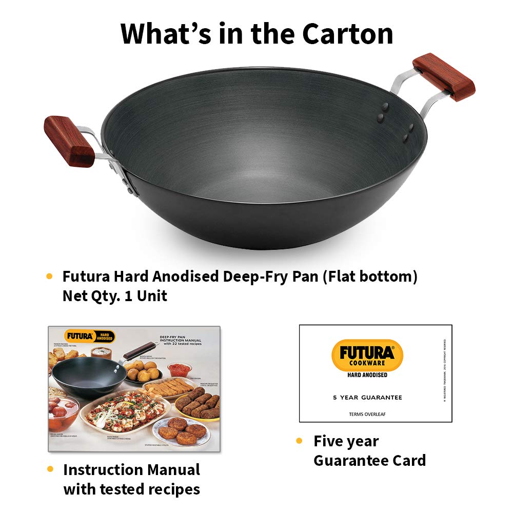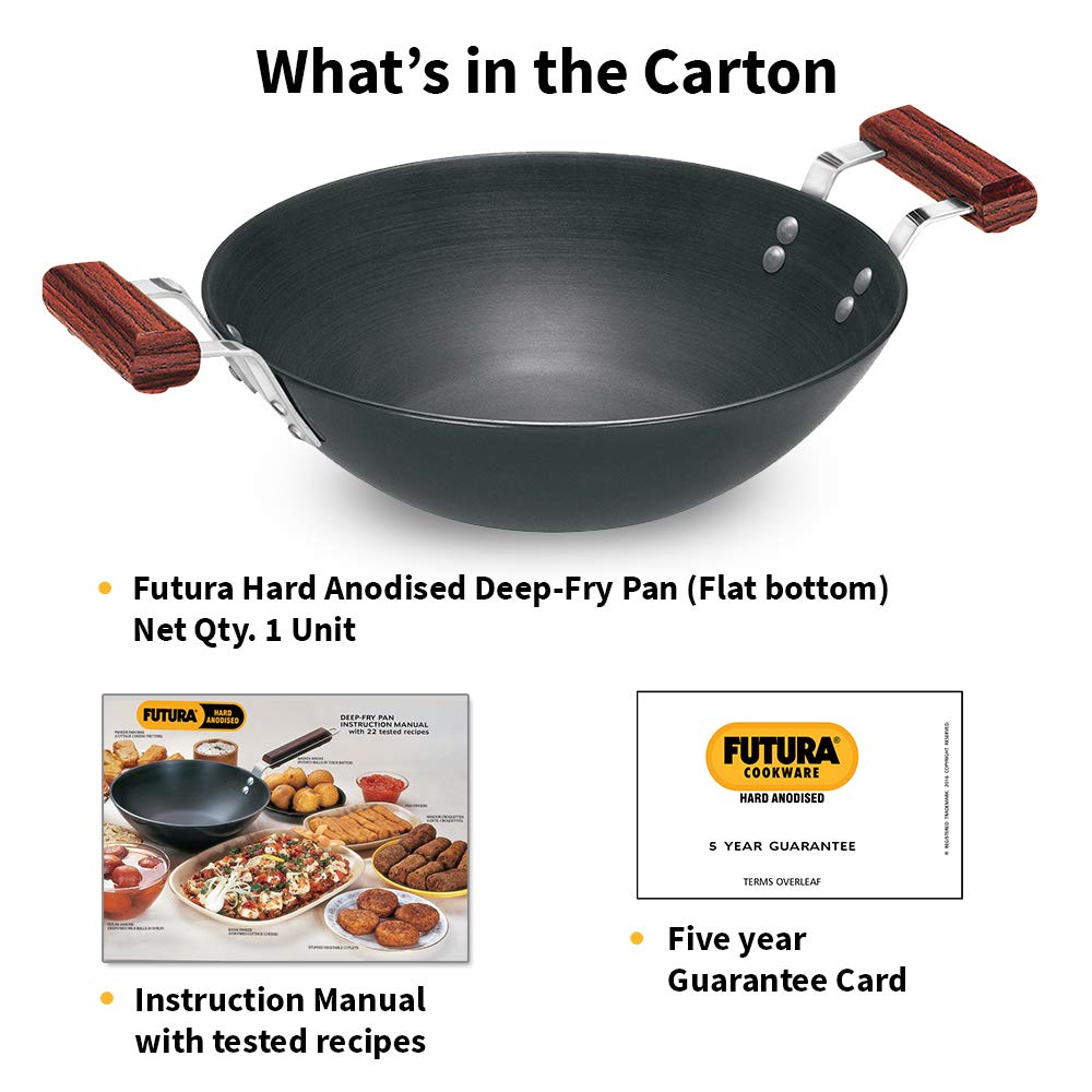 Details: The Futura Hard Anodised Deep-Fry Pans are distinguished by elegant, comfortable rosewood handles fixed on sturdy stainless steel brackets which are permanently riveted to the pans. The handles are carefully designed to provide greater comfort and safety, particularly when handling heavy loads or hot oil. The pans have curved sides suitable for deep-frying and stir-frying. The Hard Anodised finish on these pans will stay looking new for years. The pans are offered with a Flat Bottom for greater stability on gas and for use on cooktops with a flat surface such as electric, ceramic and halogen.