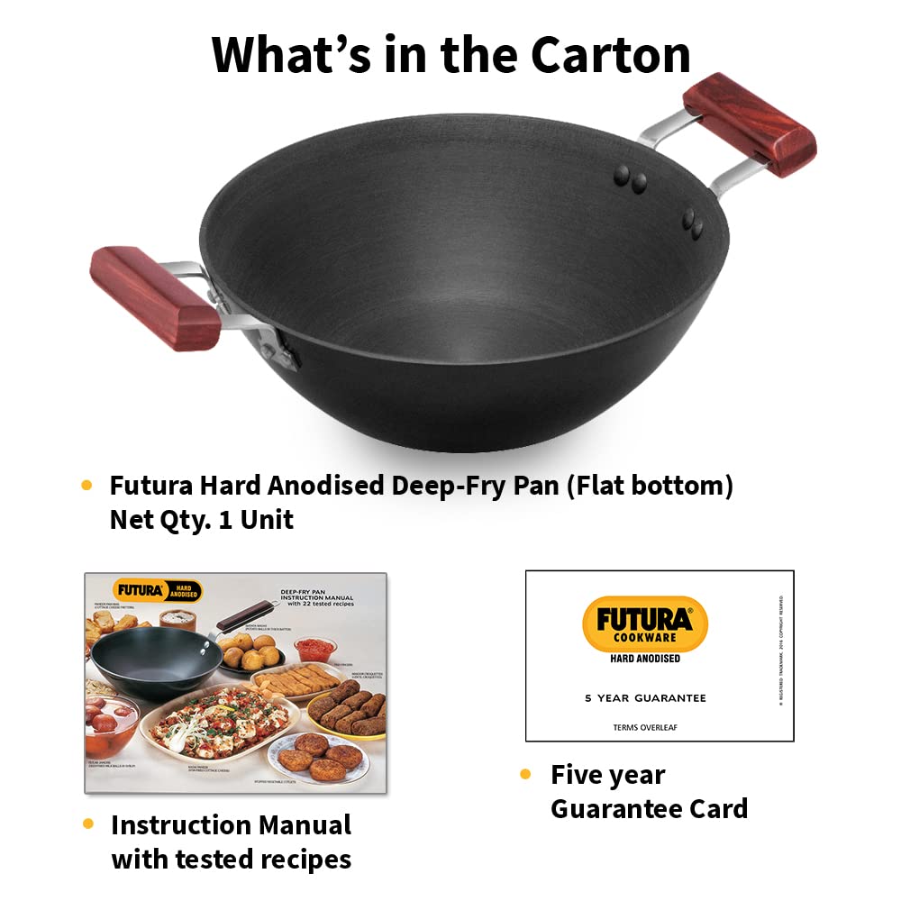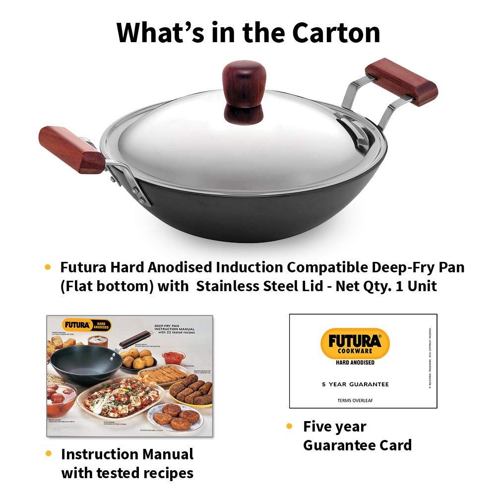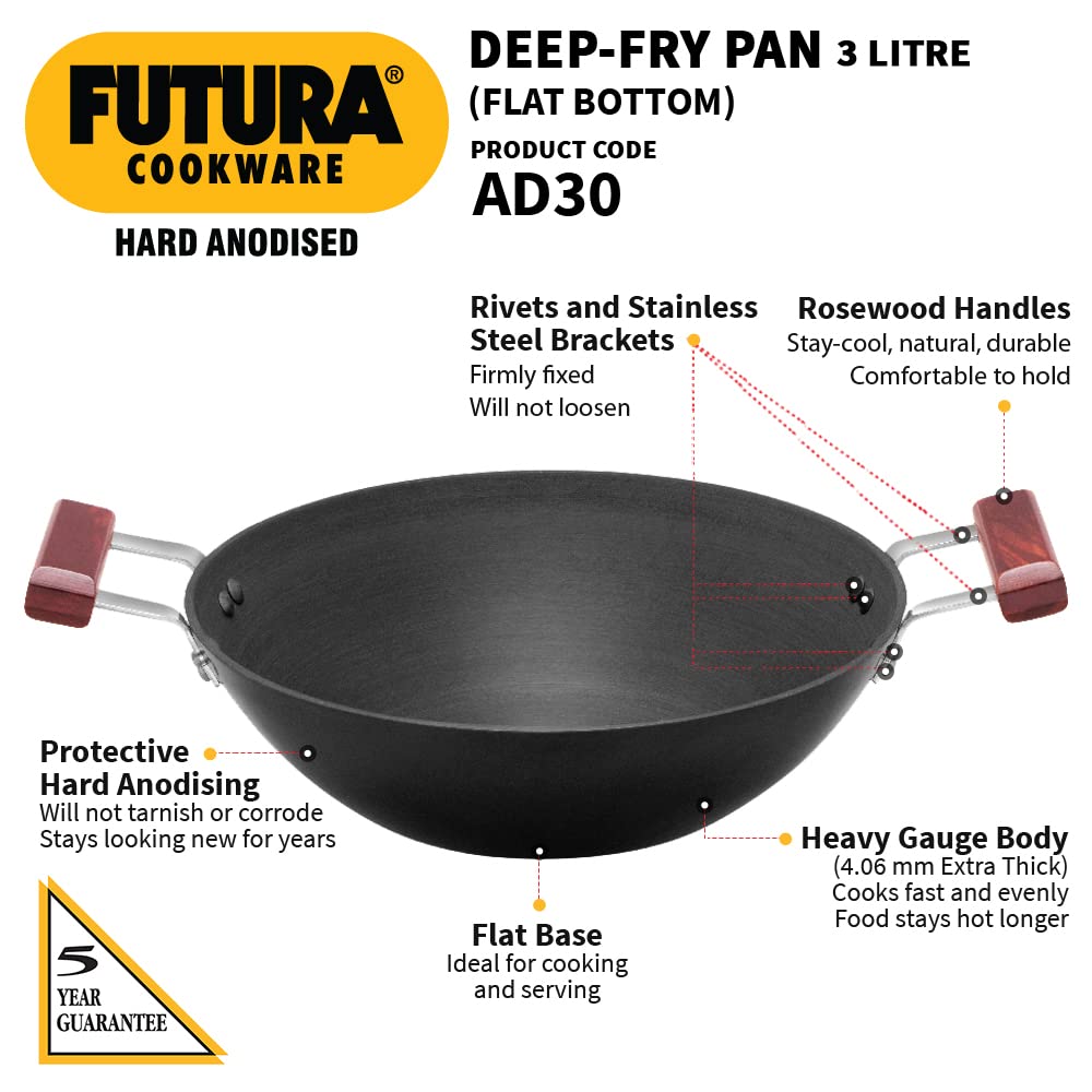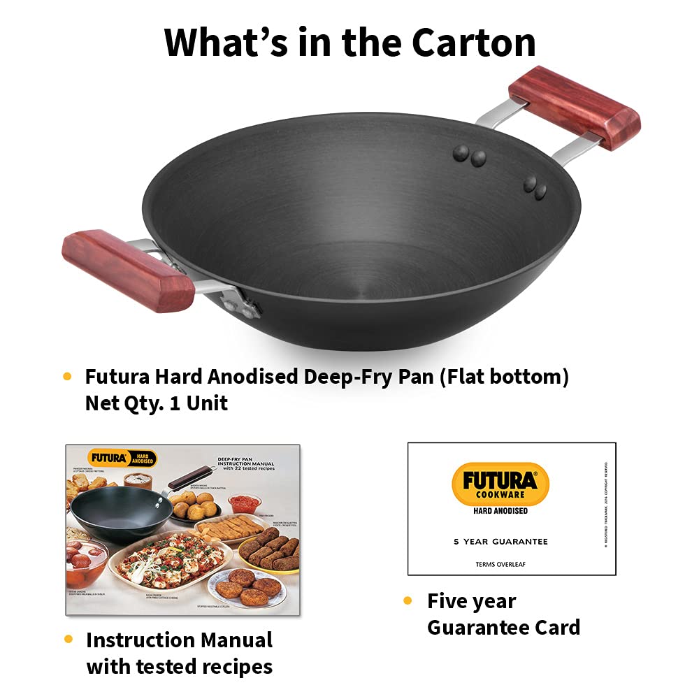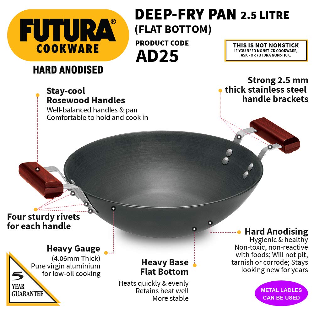 Details: The Futura Hard Anodised Deep-Fry Pans are distinguished by elegant, comfortable rosewood handles fixed on sturdy stainless steel brackets which are permanently riveted to the pans. The handles are carefully designed to provide greater comfort and safety, particularly when handling heavy loads or hot oil. The pans have curved sides suitable for deep-frying and stir-frying. The Hard Anodised finish on these pans will stay looking new for years. The pans are offered with a Flat Bottom for greater stability on gas and for use on cooktops with a flat surface such as electric, ceramic and halogen.