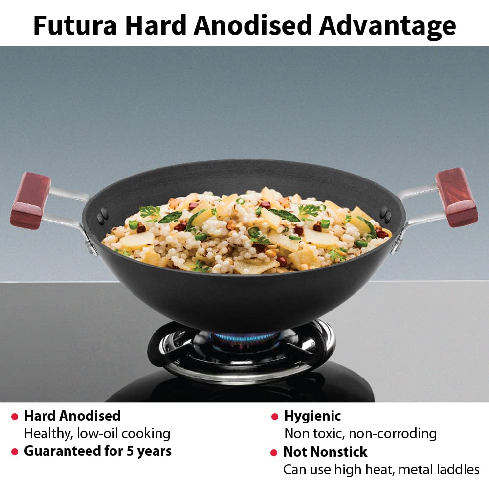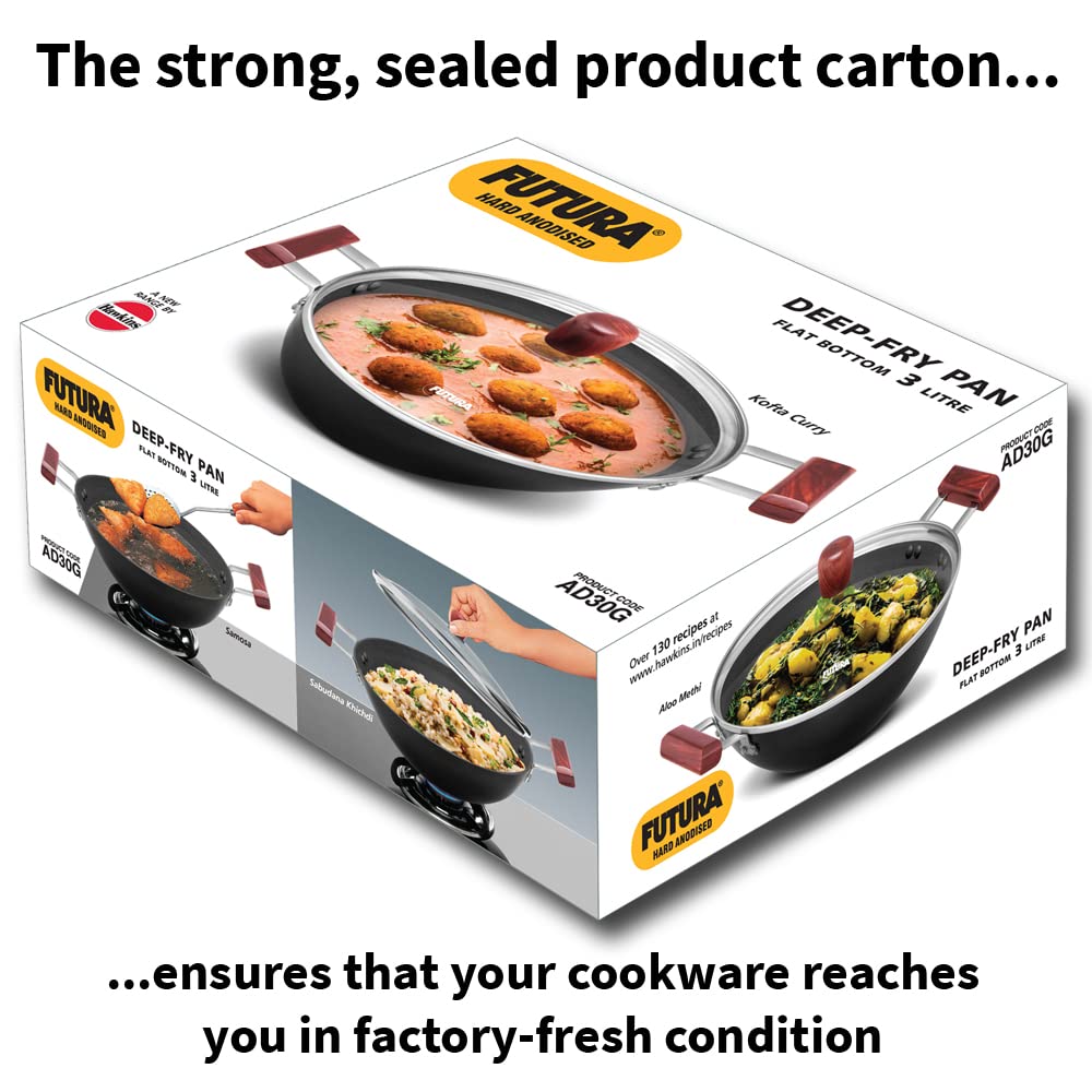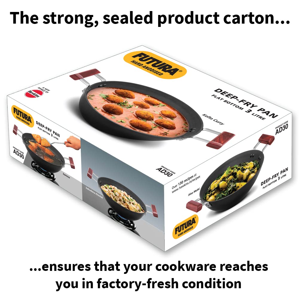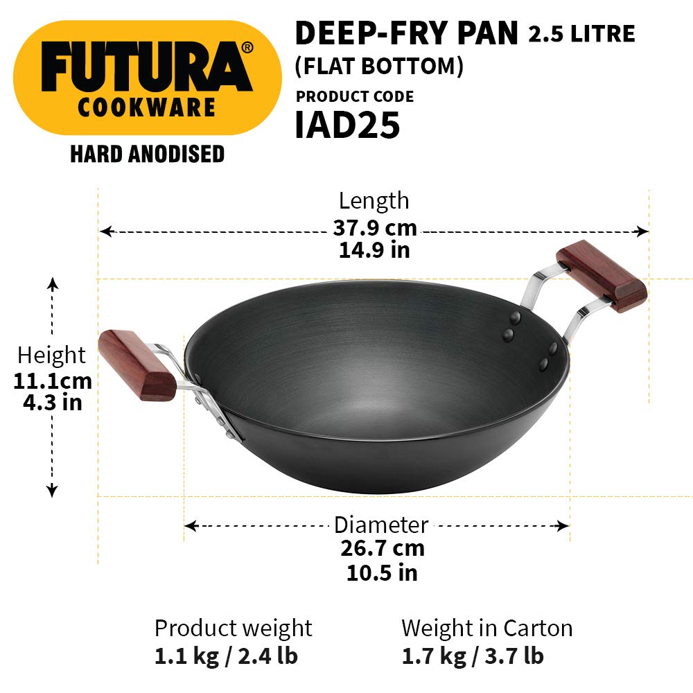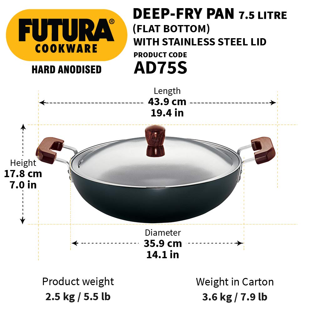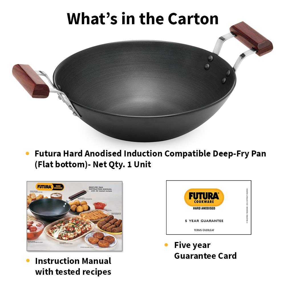 Details: The Futura Hard Anodised Deep-Fry Pans are distinguished by elegant, comfortable rosewood handles fixed on sturdy stainless steel brackets which are permanently riveted to the pans. The handles are carefully designed to provide greater comfort and safety, particularly when handling heavy loads or hot oil. The pans have curved sides suitable for deep-frying and stir-frying. The Hard Anodised finish on these pans will stay looking new for years. The pans are offered with a Flat Bottom for greater stability on gas and for use on cooktops with a flat surface such as electric, ceramic and halogen.