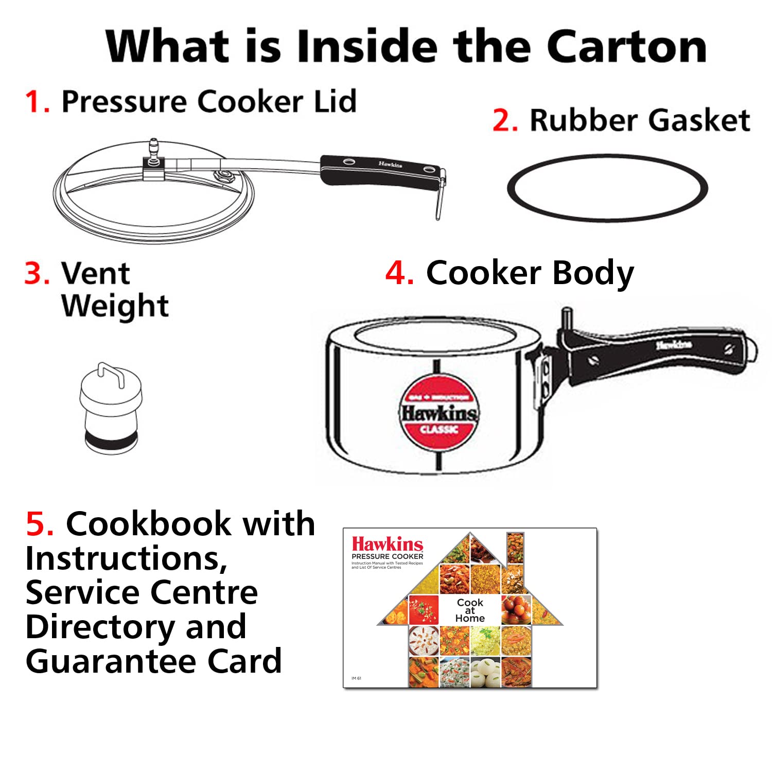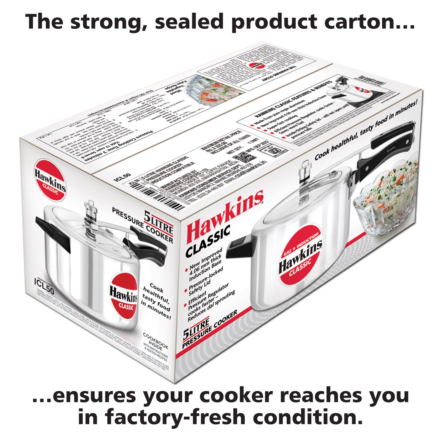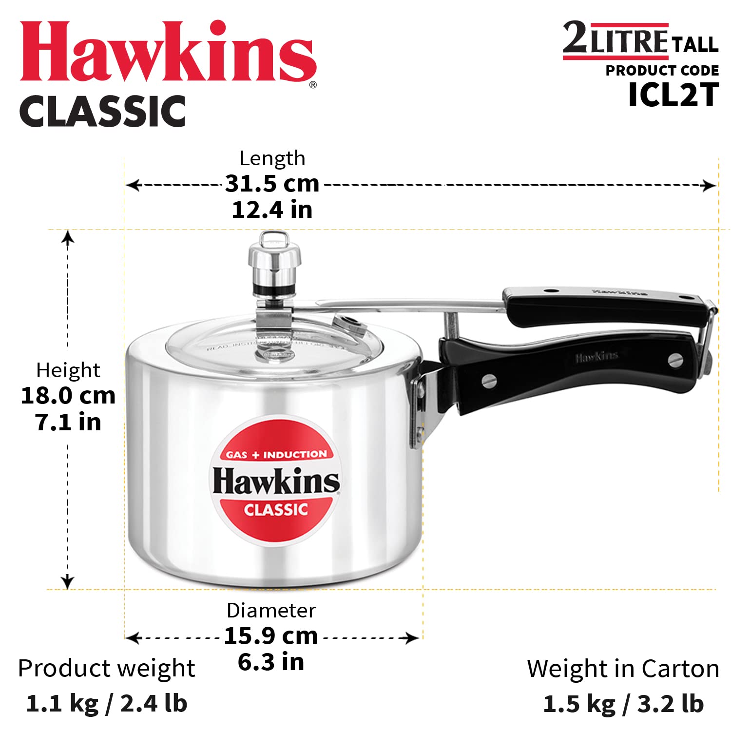 Details: The Classic is Hawkins’ largest-selling, most popular range of pressure cookers – perhaps because of its attractive combination of features, benefits and price. Each Hawkins Classic features an inside-fitting lid. This design is inherently safer than conventional cookers. Thus Hawkins Classic pressure cooker is pressure-locked for safety – like a jetliner door! This range was the first to be introduced by Hawkins and has been kept fresh and current by numerous innovations and improvements over the years. The latest improvement is a 4.06 mm new improved induction base and a superior pressure regulating system that controls pressure to a narrower, more efficient range, reduces sprouting of frothy foods (such as dal) and is easier to insert and remove. The safety valve is located under the lid handle bar so that when it operates the steam is safely deflected downwards. The gasket has minimum exposure to steam inside the cooker, does not rub every time the product is opened and closed – so lasts longer. Stay-cool handles. Fixed sturdy pivot does not put pressure on the plastic handles as it is a part of the metal handle itself. Thus handles last longer. Recommended for use on gas, electric, halogen, ceramic and induction cooktops.