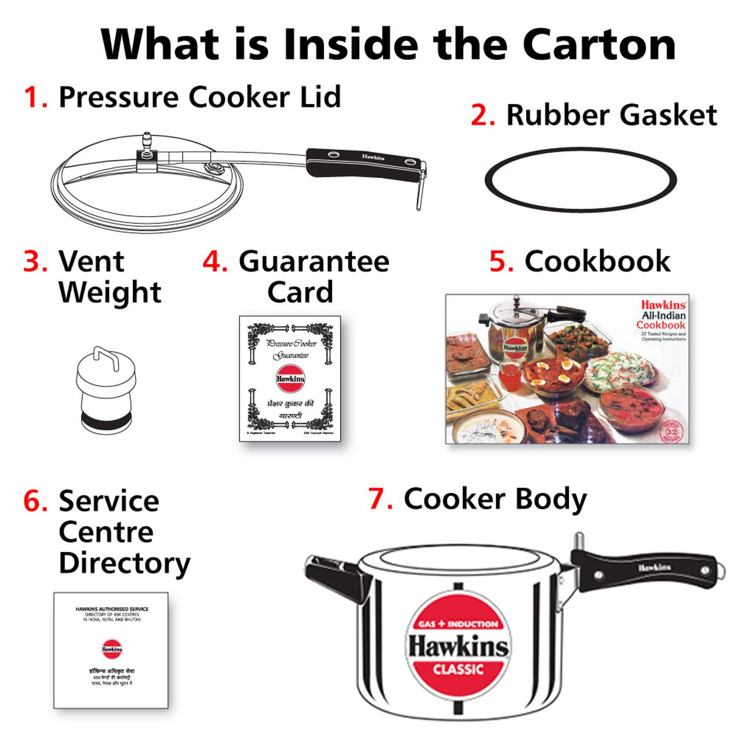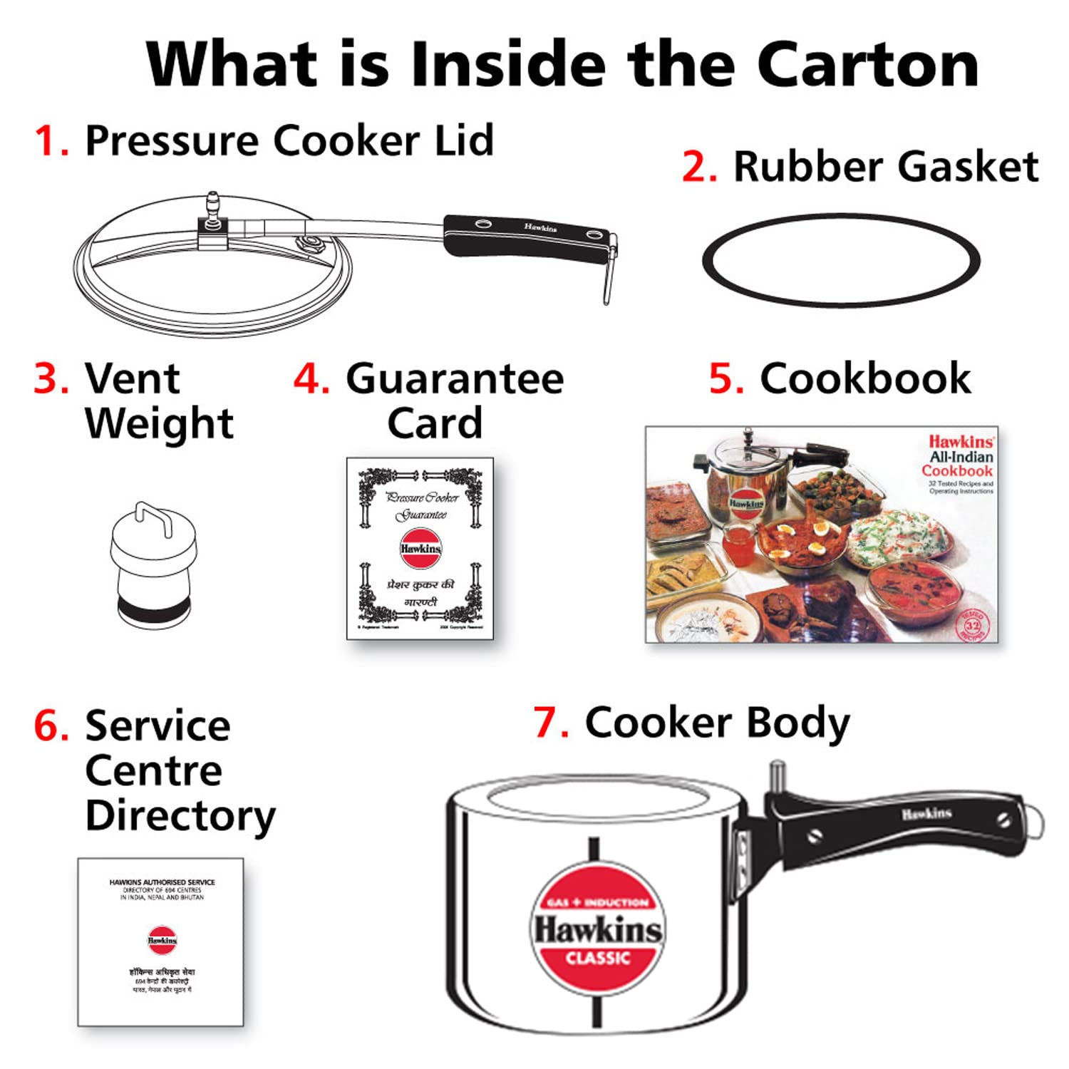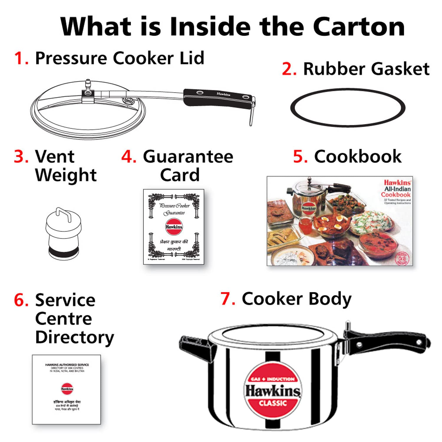 Details: The Classic is Hawkins’ largest-selling, most popular range of pressure cookers – perhaps because of its attractive combination of features, benefits and price. Each Hawkins Classic features an inside-fitting lid. This design is inherently safer than conventional cookers. Thus Hawkins Classic pressure cooker is pressure-locked for safety – like a jetliner door! This range was the first to be introduced by Hawkins and has been kept fresh and current by numerous innovations and improvements over the years. The latest improvement is a 4.06 mm new improved induction base and a superior pressure regulating system that controls pressure to a narrower, more efficient range, reduces sprouting of frothy foods (such as dal) and is easier to insert and remove. The safety valve is located under the lid handle bar so that when it operates the steam is safely deflected downwards. The gasket has minimum exposure to steam inside the cooker, does not rub every time the product is opened and closed – so lasts longer. Stay-cool handles. Fixed sturdy pivot does not put pressure on the plastic handles as it is a part of the metal handle itself. Thus handles last longer. Recommended for use on gas, electric, halogen, ceramic and induction cooktops.