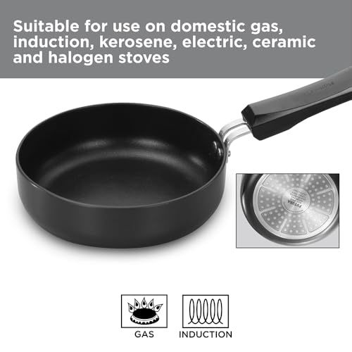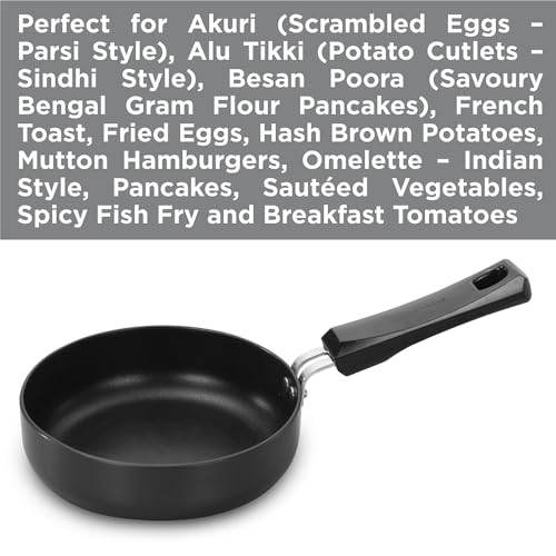 Details: Hawkins Futura Frying Pan features a PFOA Free Non-stick coating seamlessly bonded to tough Hard Anodised Aluminium, ensuring durability and superior cooking performance. Renowned for its heavy gauge construction and impeccable balance, the Futura Frying Pan makes cooking effortless and results consistently delicious. Experience comfort and convenience like never before with the stay-cool plastic handle, ensuring a secure grip and comfortable maneuverability. This pan comes complete with a Lid crafted from AISI 304, 18/8 food-grade Stainless Steel, which is renowned for its hygiene, durability, and non-reactivity to most foods. The Lid's comfortable, stay-cool plastic knob adds a finishing touch to this pan. This Frying Pan is suitable for use on gas, induction, kerosene, electric, ceramic, and halogen. From traditional delights like Akuri and Alu Tikki to international favorites like French Toast and Pancakes, this frying pan caters to a myriad of culinary creations.